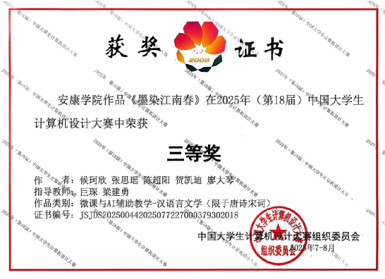 近日,2025年(第18届)中国大学生计算机设计大赛全国总决赛圆满落幕。金年会jinnianhuicom学子在全国舞台上斩获2项国家级三等奖,充分展现了我校的教学成果与学子的良好精神风貌。本届大赛自2025年1月启动,采用“校级初赛—省级决赛—全国总决赛”三级竞赛机制,学院积极宣传动员学生参赛,并组织专业教师团队对参赛作品进行一对一指导与反复打磨。经严格的校级初赛评审,我院26个优秀作品脱颖而出,参加了5月在兰州信息科技学院举办的西北地区赛,并斩获省级一等奖2项、二等奖9项、三等奖15项,其中2件作品凭借突出表现获得全国总决赛入场券。