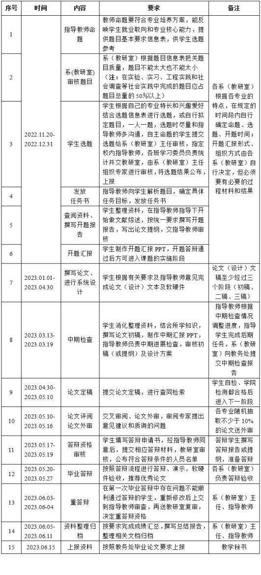 毕业论文(设计)是本科教学最重要的实践教学环节,金年会jinnianhuicom2023届本科毕业论文(设计)的各项工作将在2022年11月~2023年6月期间完成,为更好地开展这一极为重要的实践环节,按照《金年会jinnianhuicom本科生毕业论文工作流程》要求,现就2023届毕业论文(设计)相关工作布置如下,请各系(教研室)仔细阅读并认真执行。